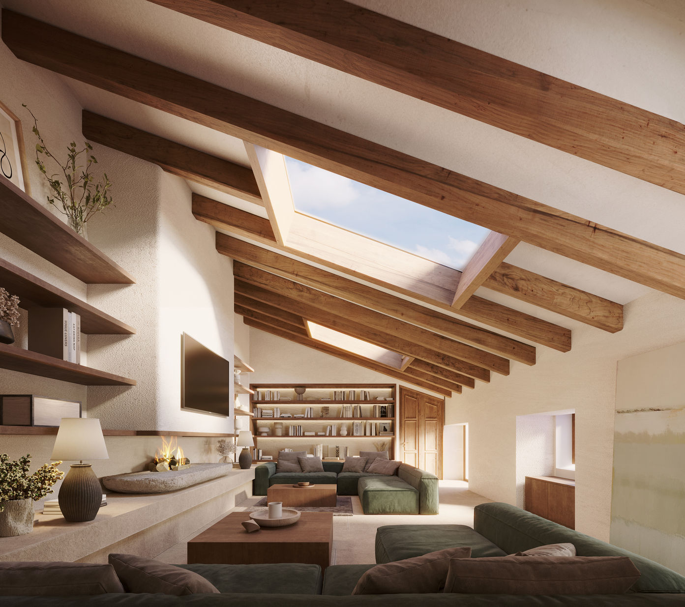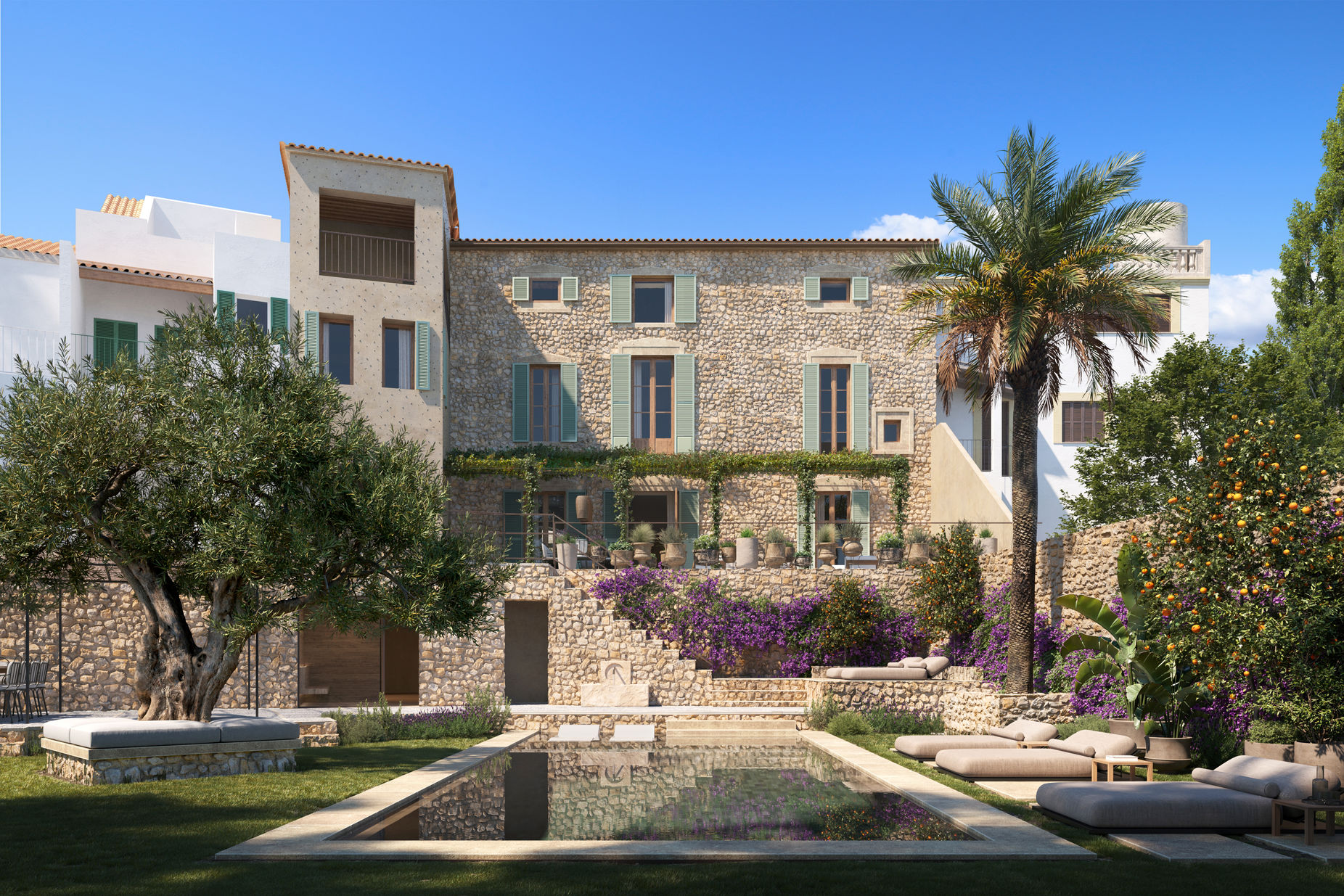 Can Palou is a residence located in the old town of Alaró, at the foothills of the Tramuntana mountain range, maintaining a distinct essence of classical Mallorcan architecture. This renovation project aims to preserve its character and iconic elements, creating a signature style. The space is organized with a ground floor housing all common areas and a porch providing access to a spacious modern pool with integrated garden and pergolas. Additionally, there is a dedicated area for a gym and a sauna, offering breathtaking views of the mountain range.